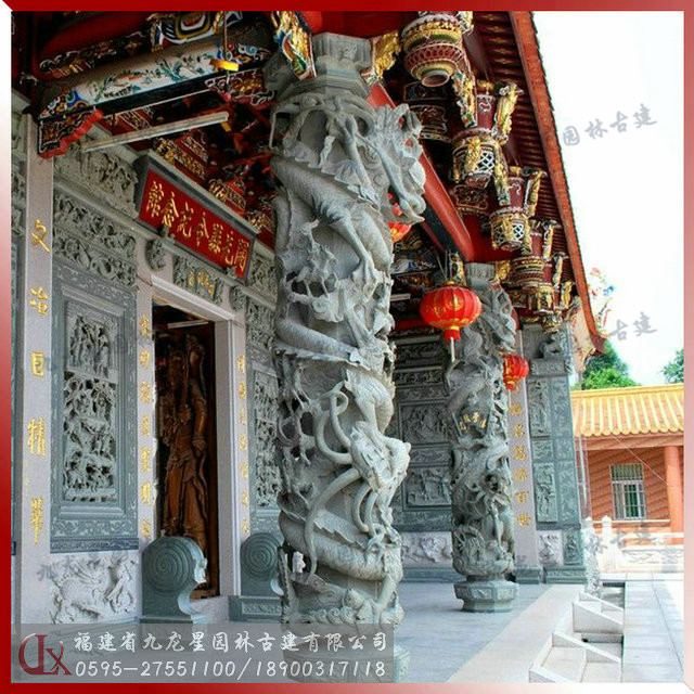 寺廟石雕龍柱是一種龍形浮雕圓柱,通身塑有纏柱云龍,栩栩如生,立在廣場路邊成為景觀和地標。在我們福建閩南沿海地區幾乎逢廟必有龍柱,讓人可以從龍的軀體雕鑿中感受到古代藝匠想要極力表達的“龍行虎步”、“龍虎精神”的意念。龍柱是中華民族的傳統建筑物,有著悠久的歷史。